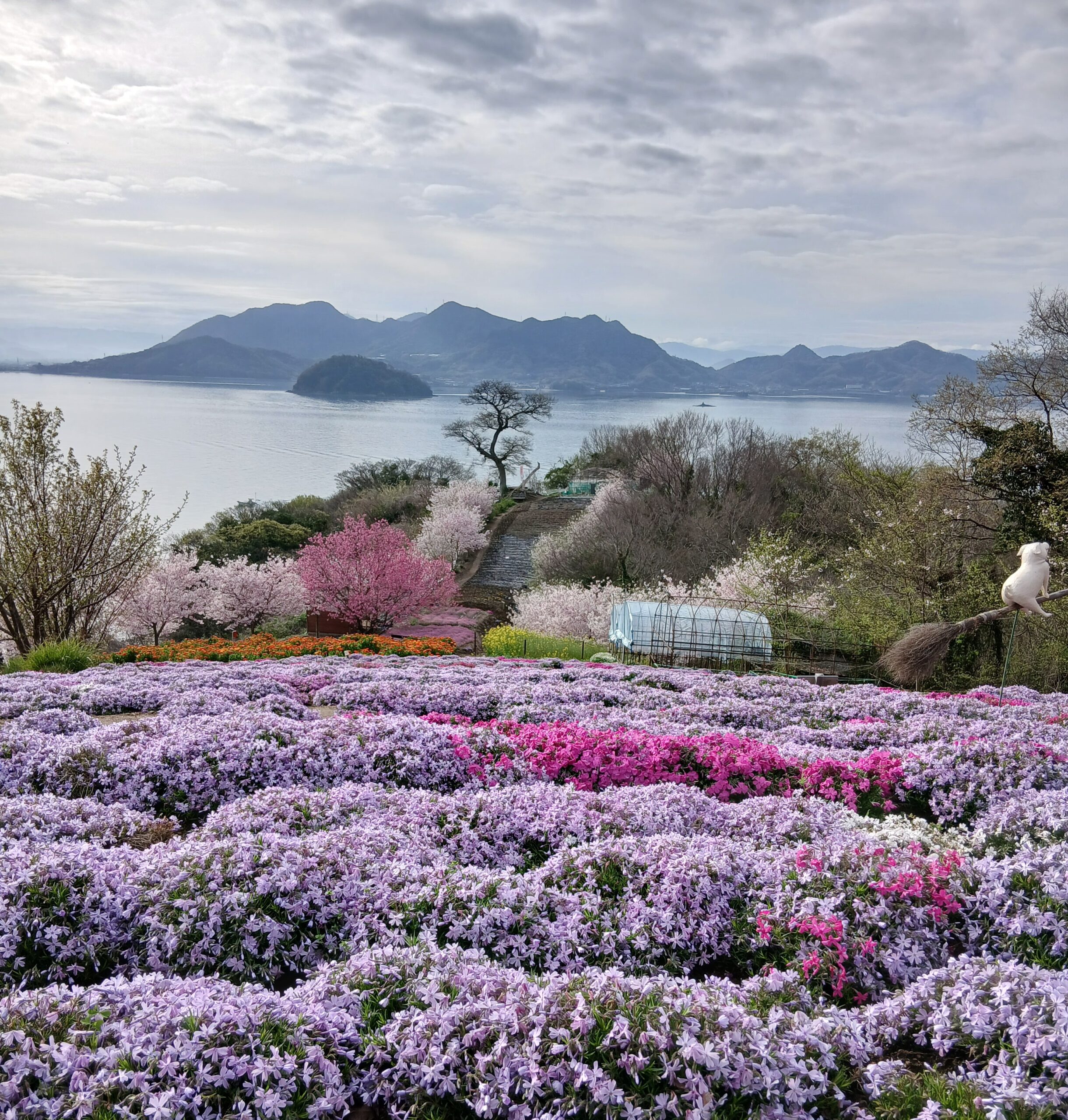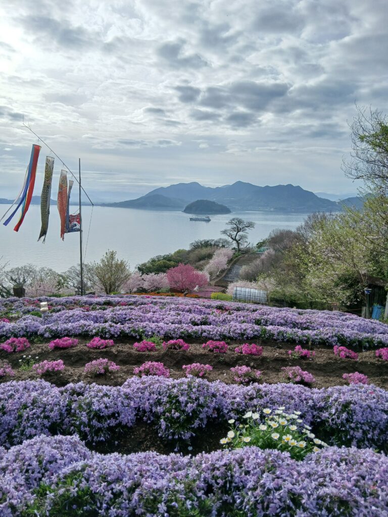 紫色の花はまことの言うとおり、シバザクラだ!花畑は小高い山の上にあるんだけど、竹やぶの中とかを通っていくんだけど、テレビなどで紹介されるようになってたくさん人が来てたよ!帰りのフェリーは70人くらいしか乗れないフェリーだったから、満員だったぜ!4月が一番いろんな花が咲くらしい!