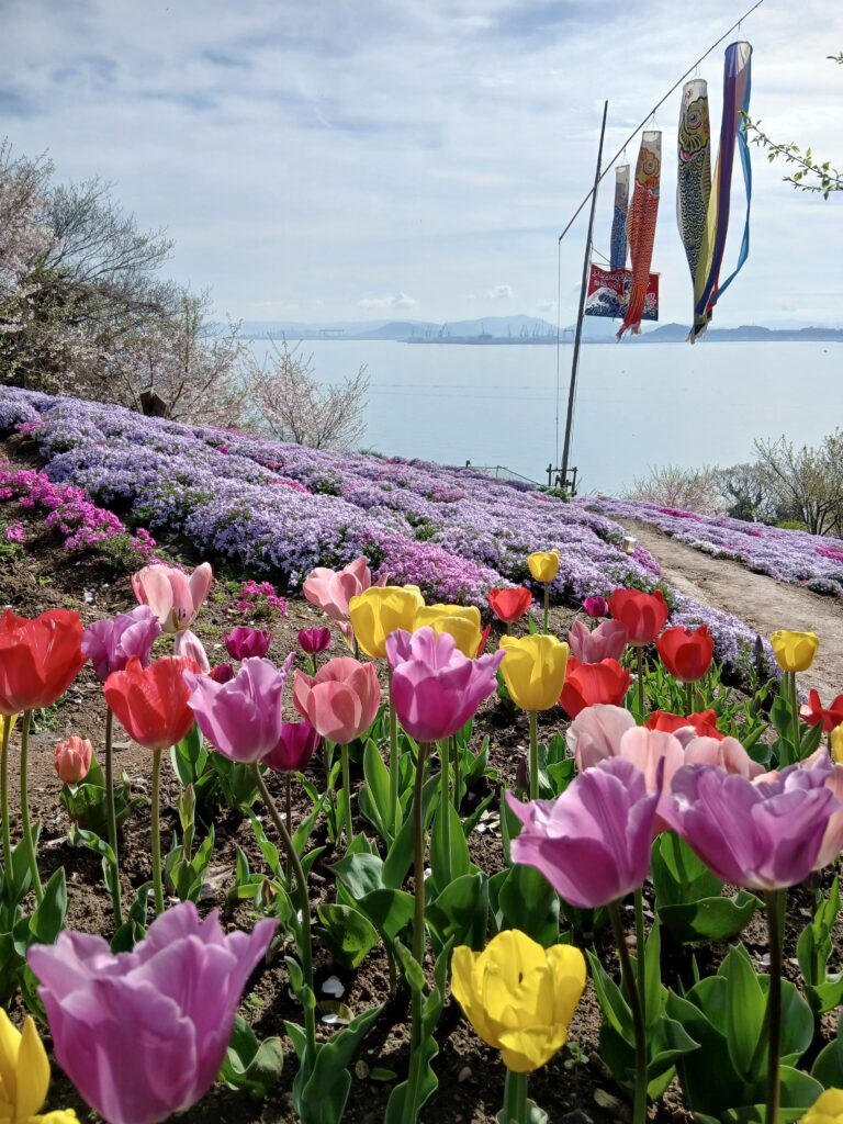 チューリップも咲いていた。天空の花畑を楽しんたあとは、志々島のシンボルともなっている、大楠の木へ。